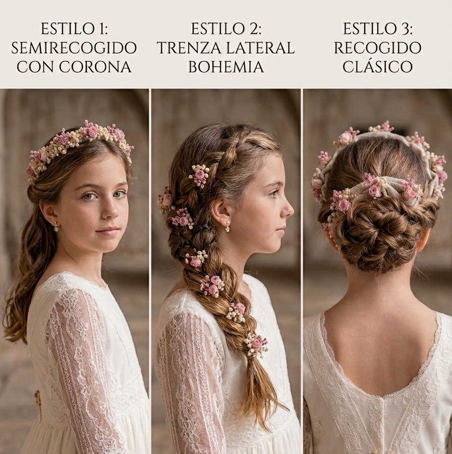 Guía completa para peinados de Comunión con flores: trucos de sujeción invisible y tres looks inspiradores para un día mágico e inolvidable