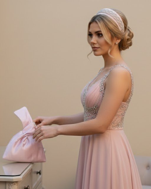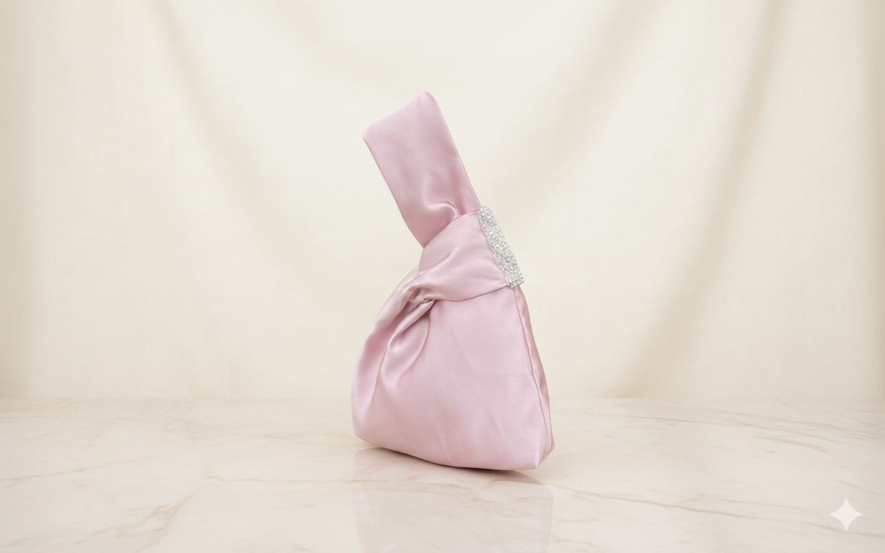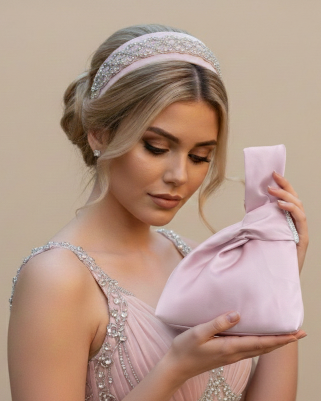 Bolso de fiesta de pedrería con elegante diseño asimétrico. Confeccionado en satén de lujo color Rosa Nude, deslumbra gracias a su banda de cristales. Perfecto para invitadas de boda, galas y cócteles. ¡Aprovecha el set y llévate la diadema de satén a juego!