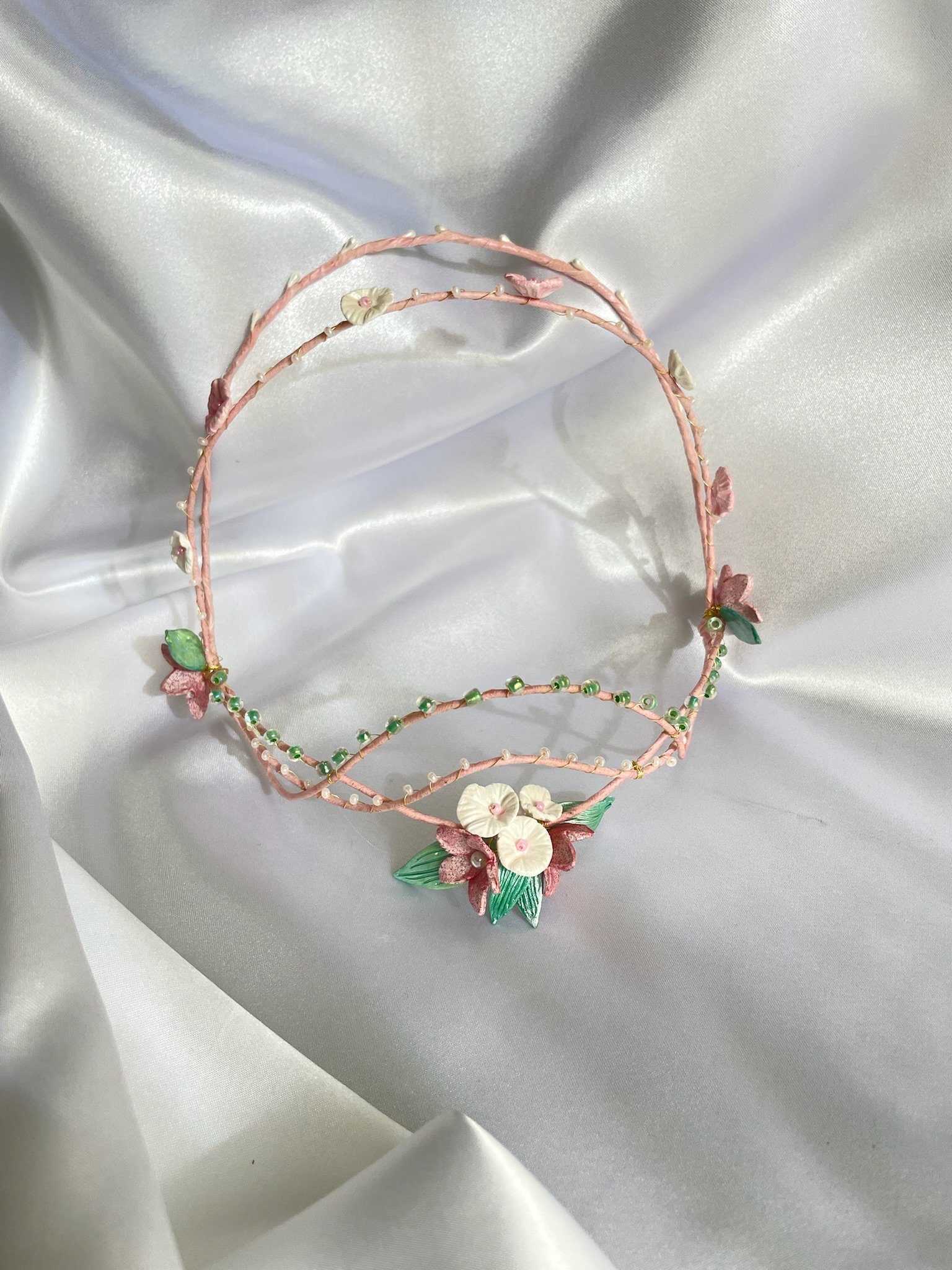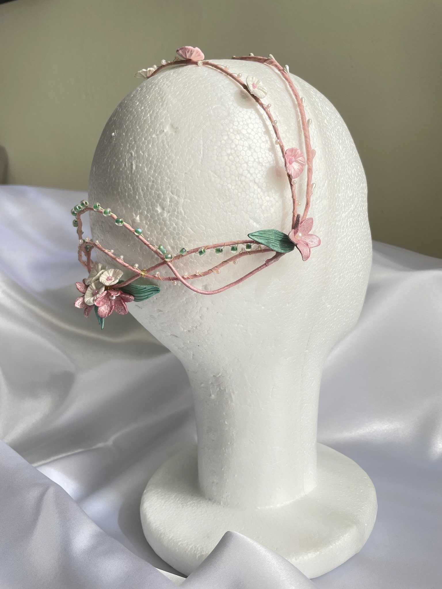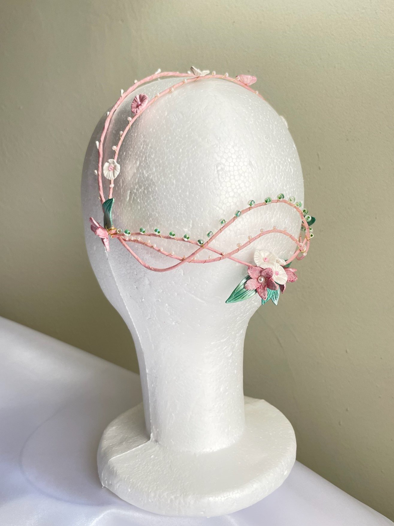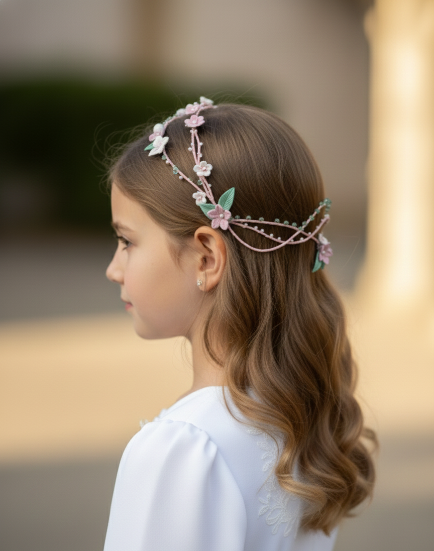 Casquete de Comunión de Ramas Rosadas y Flores de Porcelana. Delicada corona semirrígida elaborada artesanalmente con ramas de alambre forrado en tono rosa pastel, adornada con pequeñas perlas blancas, cuentas de cristal verde claro y exquisitas flores de porcelana fría en tonos rosa empolvado y blanco. Un accesorio etéreo y romántico, perfecto para completar el look de Primera Comunión o para damitas de honor.
