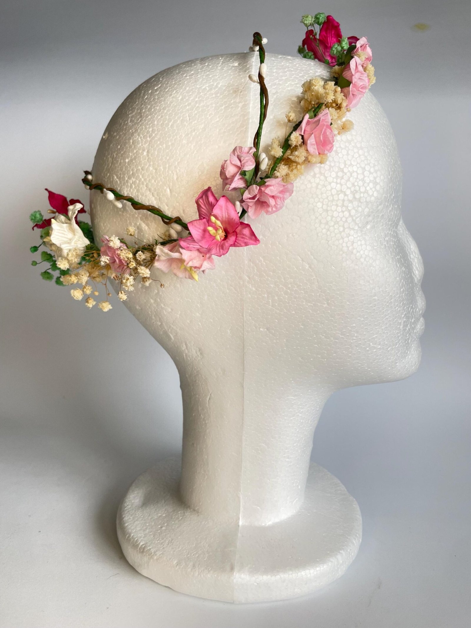 Corona Casquete de Comunión de Flores Rosa y Fucsia artesanal, estilo boho-campestre. Hecha a medida, tendencia 2026. ¡Un tocado exclusivo lleno de delicadeza!