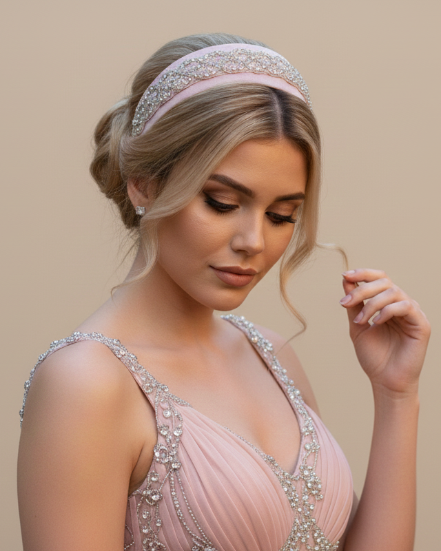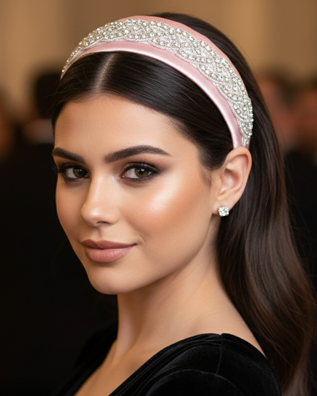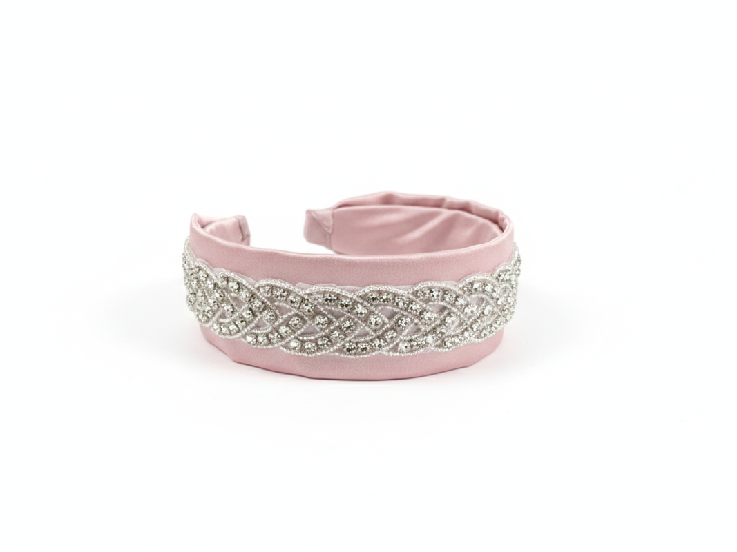 Confeccionada en suave satén color rosa empolvado, esta diadema es tan cómoda como chic. El detalle central de pedrería brillante crea un hermoso efecto trenzado que capta la luz. Perfecta para realzar la belleza en eventos de día o de noche. ¡Un accesorio elegante para brillar!