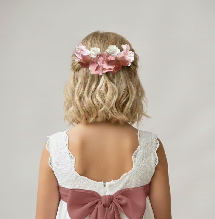 La peineta para recogido comunión arras que estabas buscando. La “Rose Embassy” es una pieza de alta artesanía, creada a mano con flores de papel impermeabilizado y tela en un diseño dulce de tonos blanco y rosa palo. Es la elección ideal para Primera Comunión o damitas de arras, destacando por su confort, ligereza y, lo más importante, su capacidad de personalización total del color, a juego con el fajín o cualquier complemento. Un tesoro artesanal para un día inolvidable.