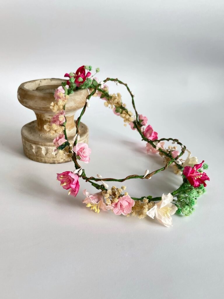 Este diseño bohemio y floral tiene un toque angelical que realza el rostro de las niñas. Se adapta perfectamente a cualquier peinado y resulta ideal para quienes buscan un look diferente. Además, permite combinarse con otros complementos de comunión personalizados, creando una imagen armoniosa y delicada.